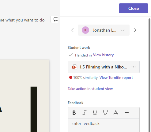 Note that only the Similarity Report will be available. The AI writing report and any marking or feedback options, found in Turnitin’s Feedback Studio, are not available, and the standard Teams Assignment interface must be used to provide feedback.