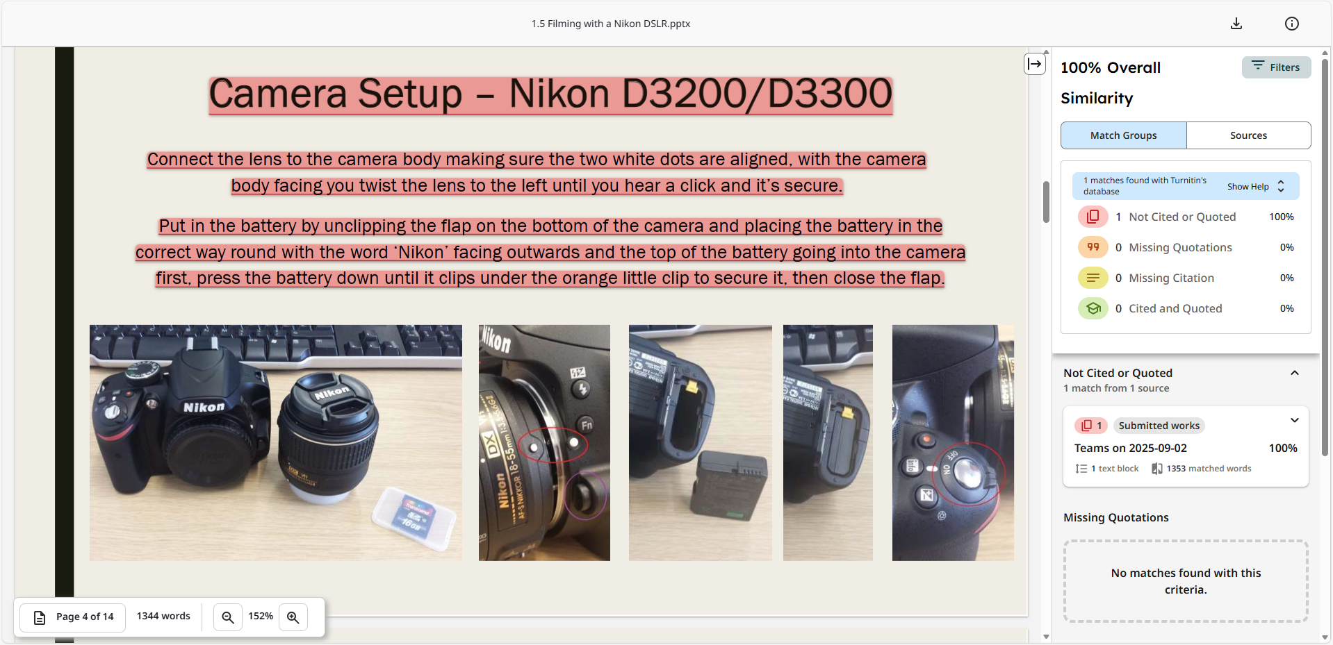 The similarity score lets you see if (an how much) text from your student’s submission was found in Turnitin’s extensive database, indicating potential plagiarism. You can see the matched sources under the “Sources” tab and the corresponding text will be highlighted in different colours in the submission.