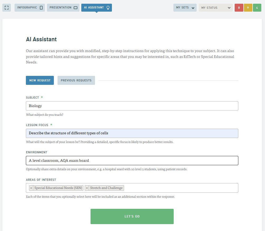 Once you have chosen a strategy, select the AI Assistant. This is where you can start tailoring the approach to your own teaching context by filling in the text boxes on the page. You are also able to see previous requests that you may have made.
