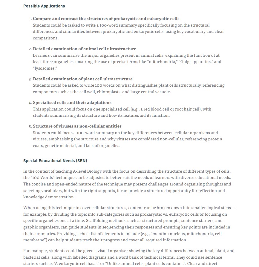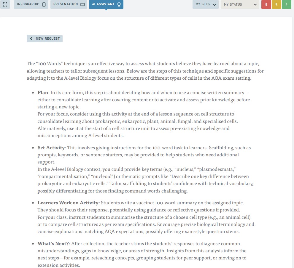 For example, you can ask the AI Assistant to make a ‘100 words’ exercise for a Biology lesson, where students are required to ‘Describe the structure of different types of cells’ in an A-Level classroom studying for an AQA exam board environment. You are also able to consider “Areas of interest”, catering your response for individual learner needs like “Special Educational Needs (SEN)” or “Stretch and Challenge.